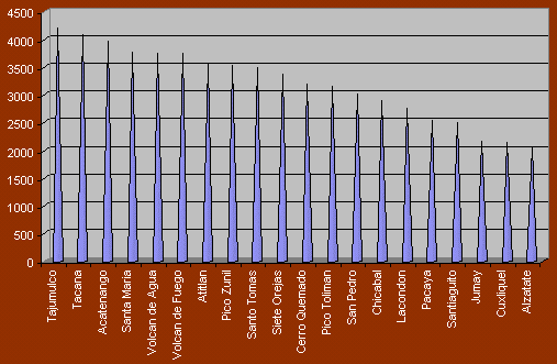 Notes: Appelé en language Maya "Chi Gag". Il est en activité depuis 1524 (plus 400 ans). Nous observons un grand nombre d'érutions et d'explosions et souvent accompagné de tremblements de terre. La dernière explosion majeure eu lieu en 1974. Pendant l'explosion la cendre tombait jusqu'au El Salvador et sur le Honduras. |